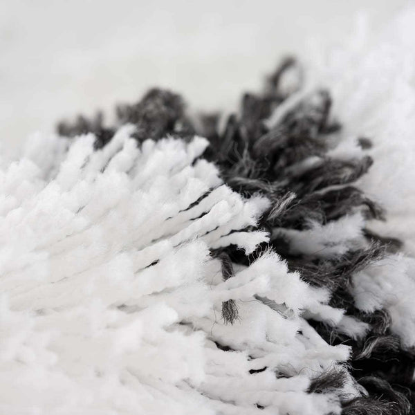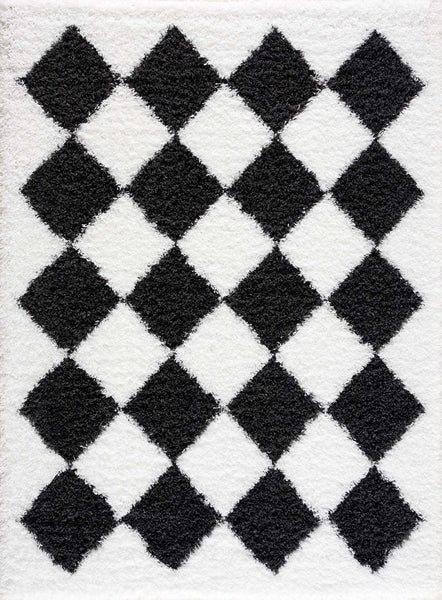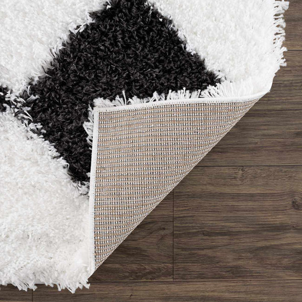 Zahur Area Rug features a white base adorned with multiple large black diamond patterns, creating a bold and stylish design. The shag construction provides a soft, plush feel underfoot, offering exceptional comfort. Durable and modern, this rug is perfect for adding a cozy yet contemporary touch to any space.