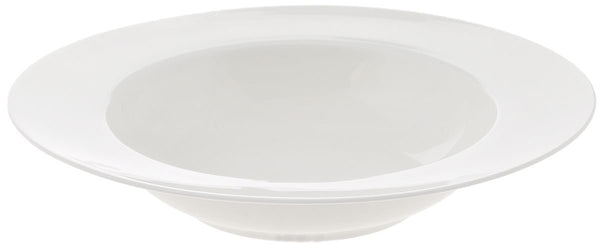 Plate, 20 oz. (600 ml), 10" dia. (25-1/2 cm), round, deep, rolled rim, dishwasher/microwave safe, ovenproof (up to 572°F/300°C), fully vitrified, fine porcelain, white.