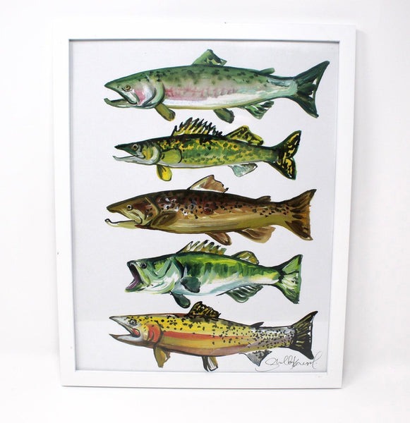 This is a fun fish print hand painted with acrylic paint on watercolor paper. The fish on this print are Pan Fish- a walleye, perch, bluegill, pike, and bass. It was painted right by the waters edge! All fish you can find all over Michigan and other states as well. A perfect gift or home decor for fisherman, outdoorsman, or anyone else who loves some good wildlife artwork and