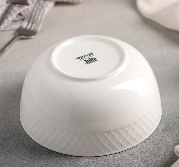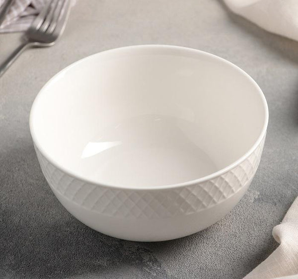 Julia Bowl, 31 oz. (930 ml), 6-1/2" dia. (16 cm), round, embossed, rolled rim, microwave/dishwasher safe, ovenproof (up to 572°F/300°C), fully vitrified, fine porcelain, white.