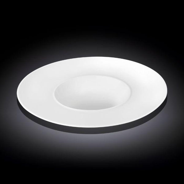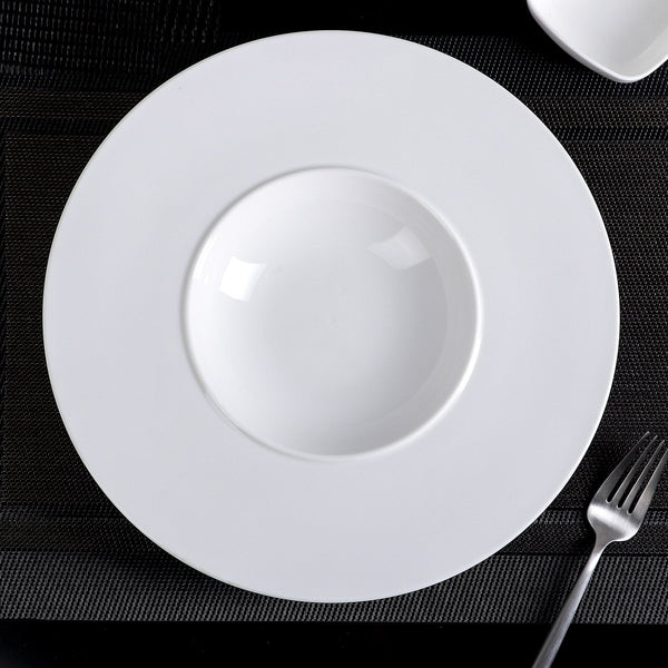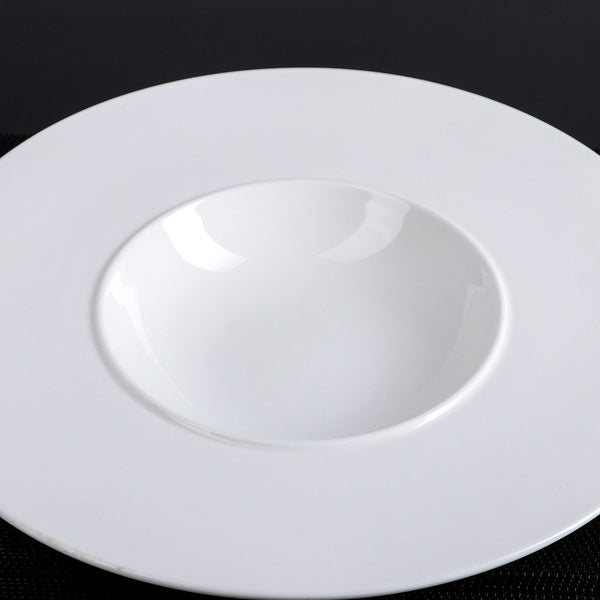 Plate, 9 oz. (280 ml), 11" dia. (28 cm), round, deep, rolled rim, dishwasher/microwave safe, ovenproof (up to 572°F/300°C), fully vitrified, fine porcelain, white.